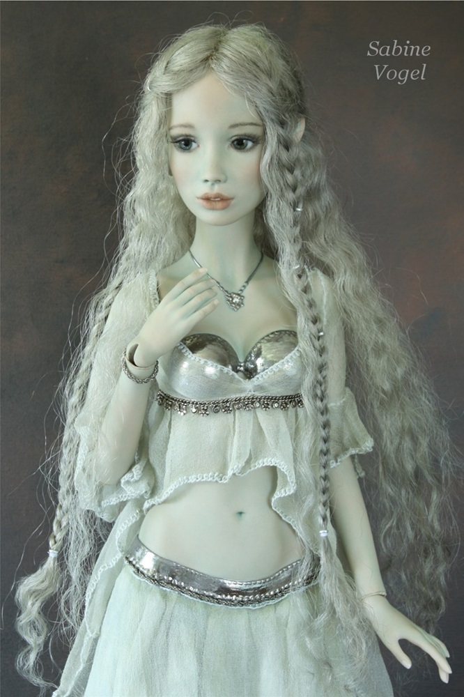 Porzellan, mit Porzellan-Farben in übereinander aufgebrannten Schichten bemalt, 16 mit Leder ausgefütterte Gelenke, graublaue Kristallglasaugen aus Lauscha, Echthaar.
