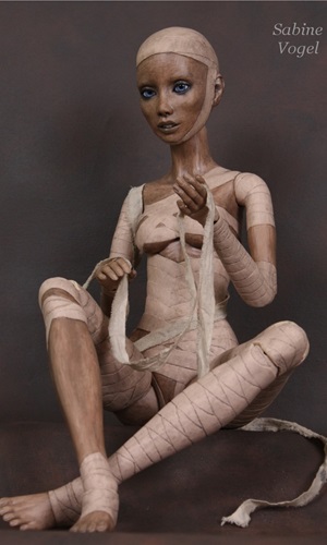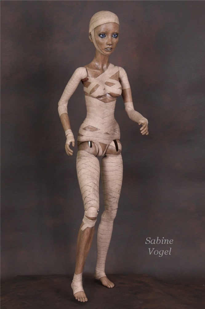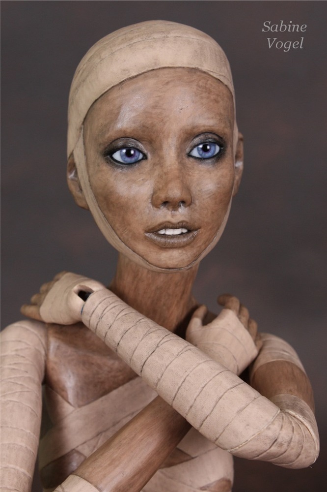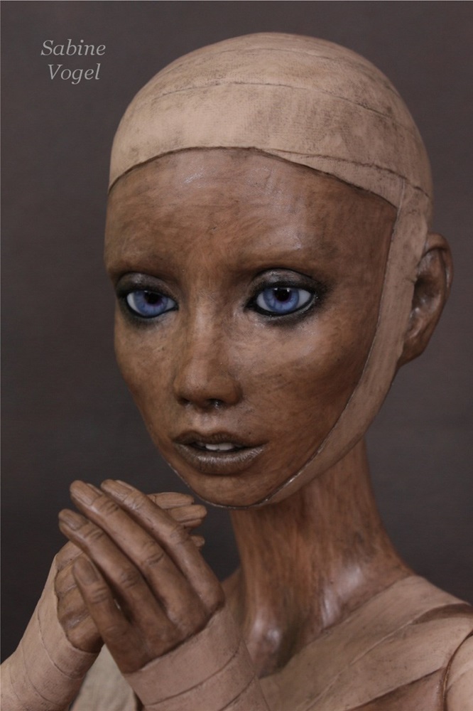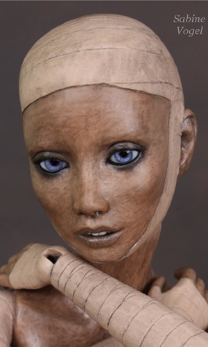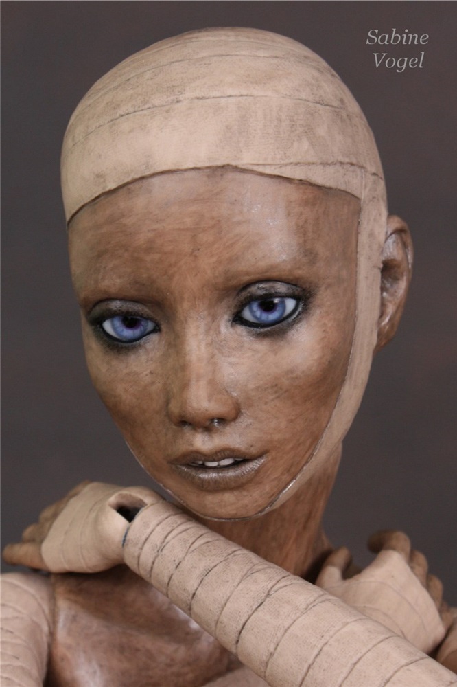Porzellan, Porzellan-Farben, blaue Kristallglasaugen, braun-blaues Echthaar Leder. Mit 14 Gelenken - Ellenbogen und Knie sind Doppelgelenke.