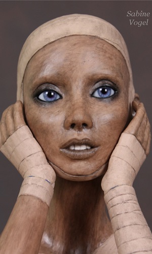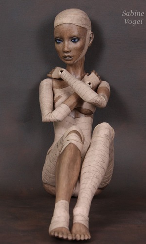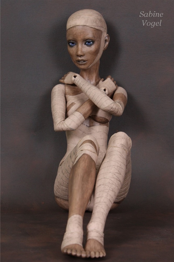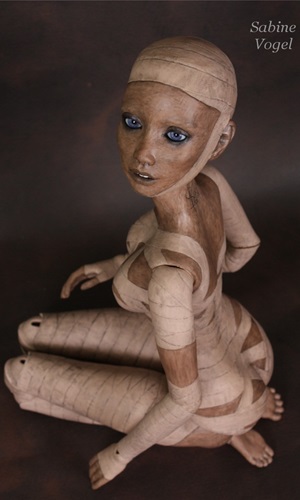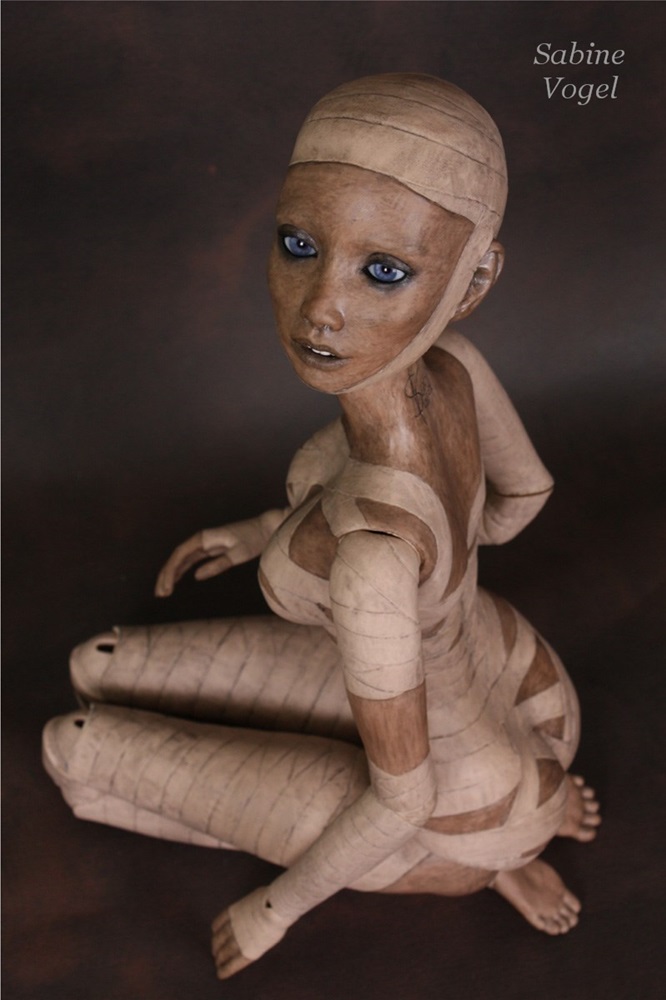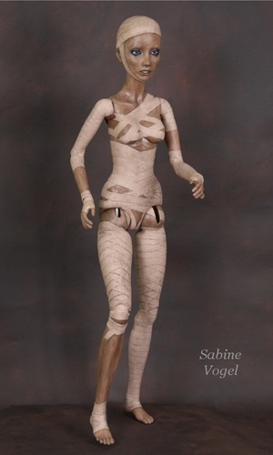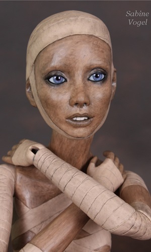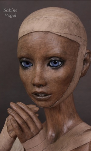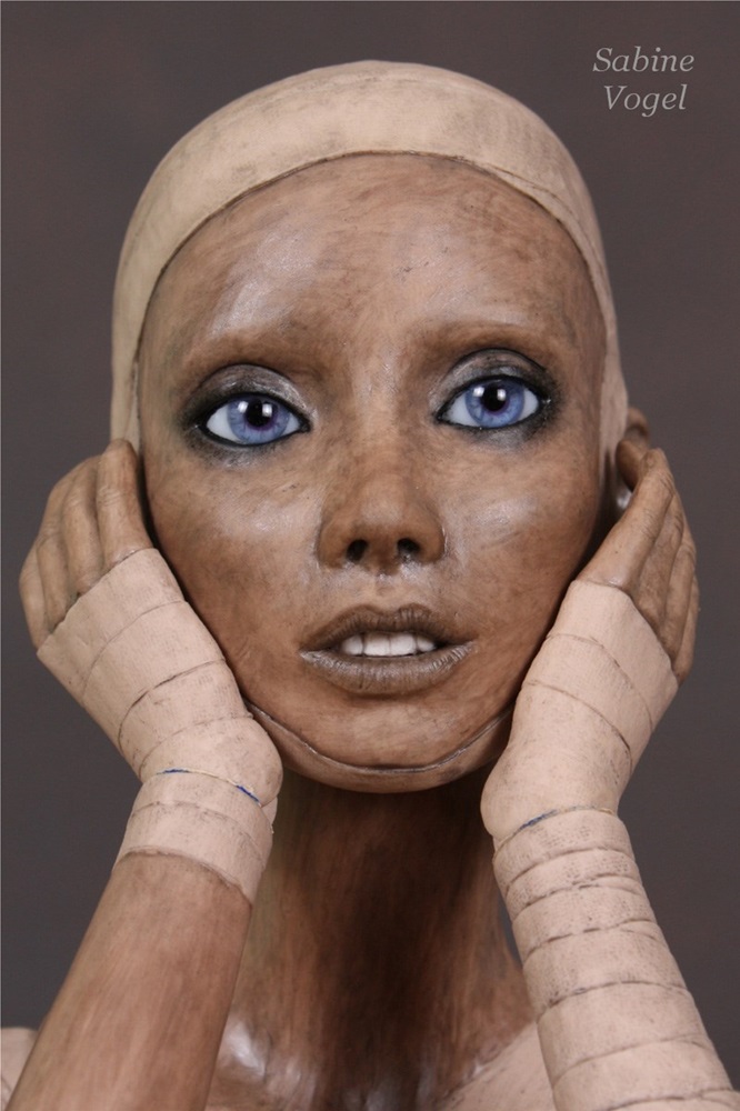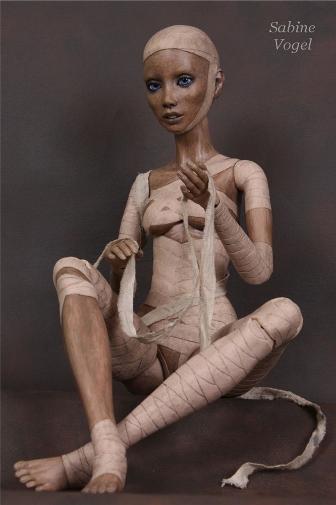 Porzellan, Porzellan-Farben, blaue Kristallglasaugen, braun-blaues Echthaar Leder. Mit 14 Gelenken - Ellenbogen und Knie sind Doppelgelenke.