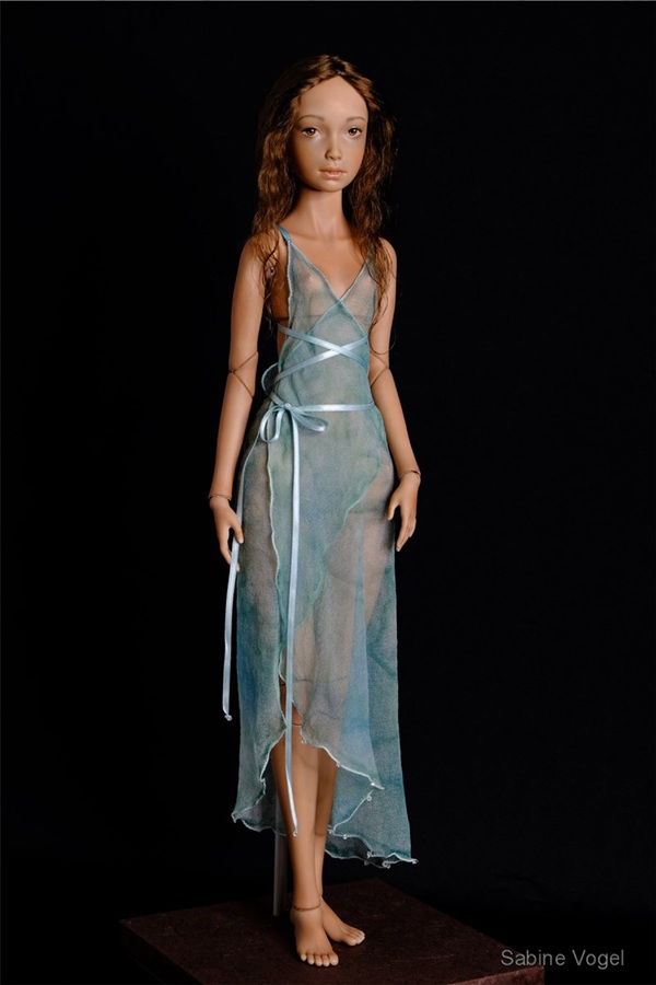 Porzellan, Porzellanfarbe, Zugfedern, magnetische Mohairhaarkappe, Leder, Vario-Kleid aus bemalter Seide mit Band.