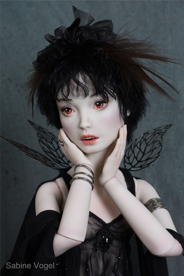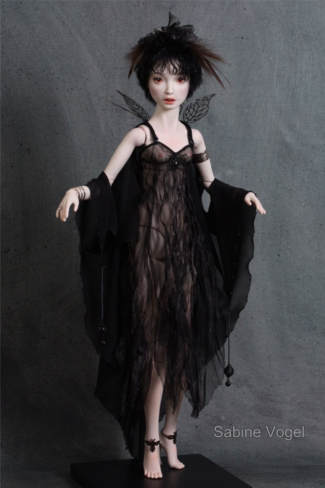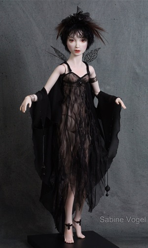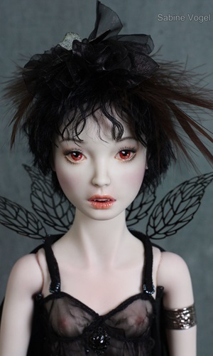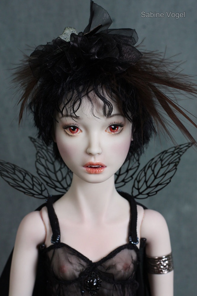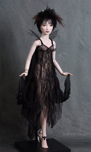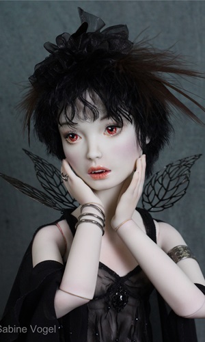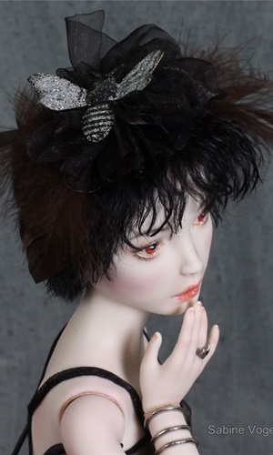 Porzellan, Porzellanfarbe, Zugfedern, Magnet, Mohair, Leder, Glanzplatin, syntetische Emaile, metallene Filigranornamente, synthetischer Stoff, japanische Itoshi Perlen, Federn.
