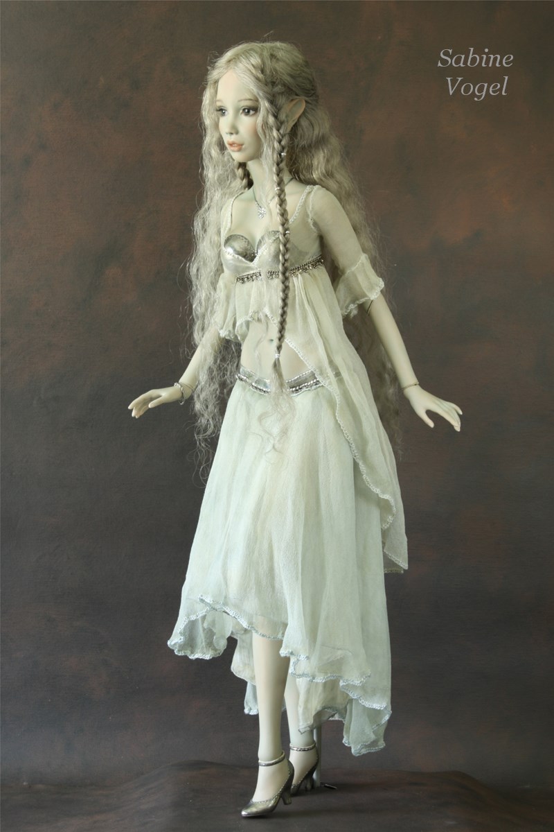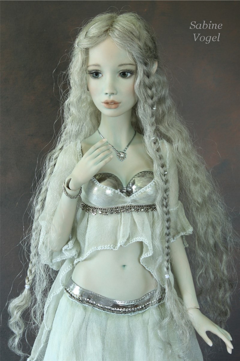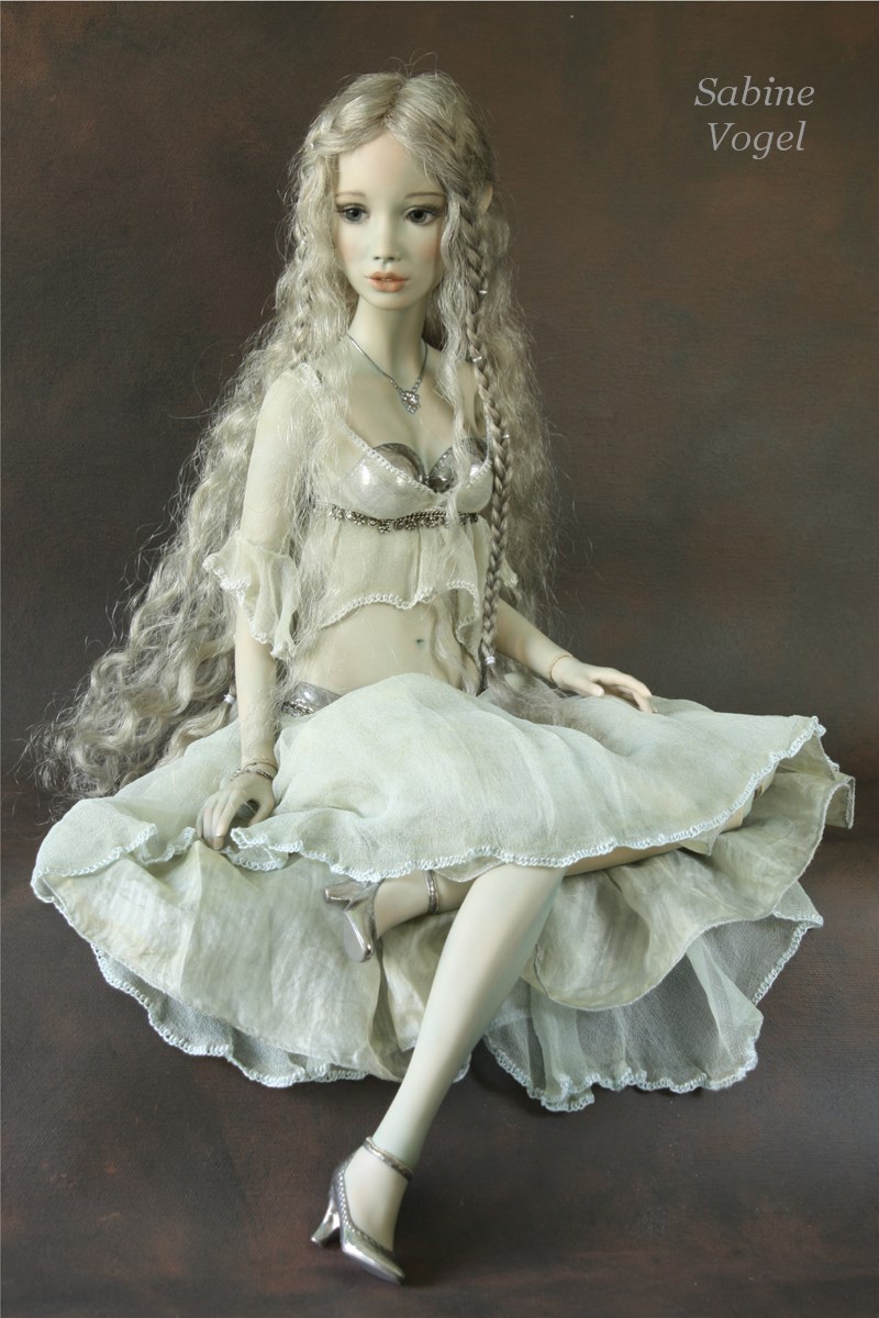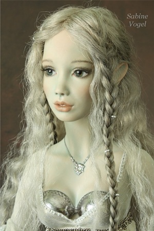 Porzellan, mit Porzellan-Farben in übereinander aufgebrannten Schichten bemalt, 16 mit Leder ausgefütterte Gelenke, graublaue Kristallglasaugen aus Lauscha, Echthaar.