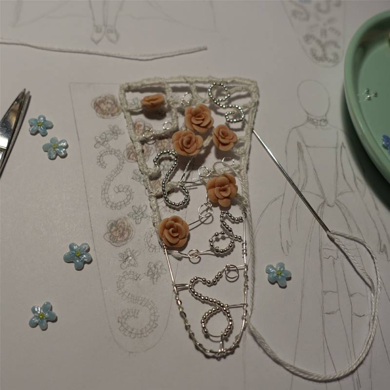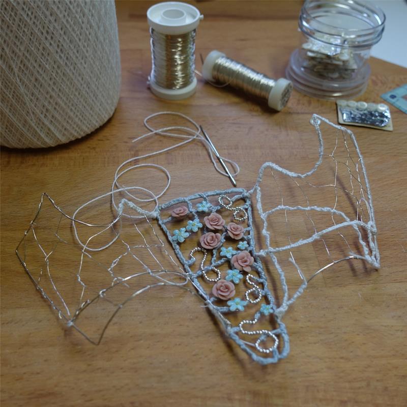 Eine Korsage für Marie aus filigranem Silberdraht. Besetzt mit versilberten Metallperlen, kleinen Röschen und den Vergissmeinnicht Blüten aus Porzellan, deren Entstehung du im letzten Video (Making of - Teil 2) sehen konntest.
