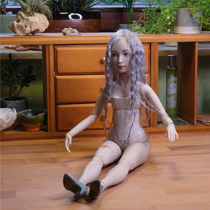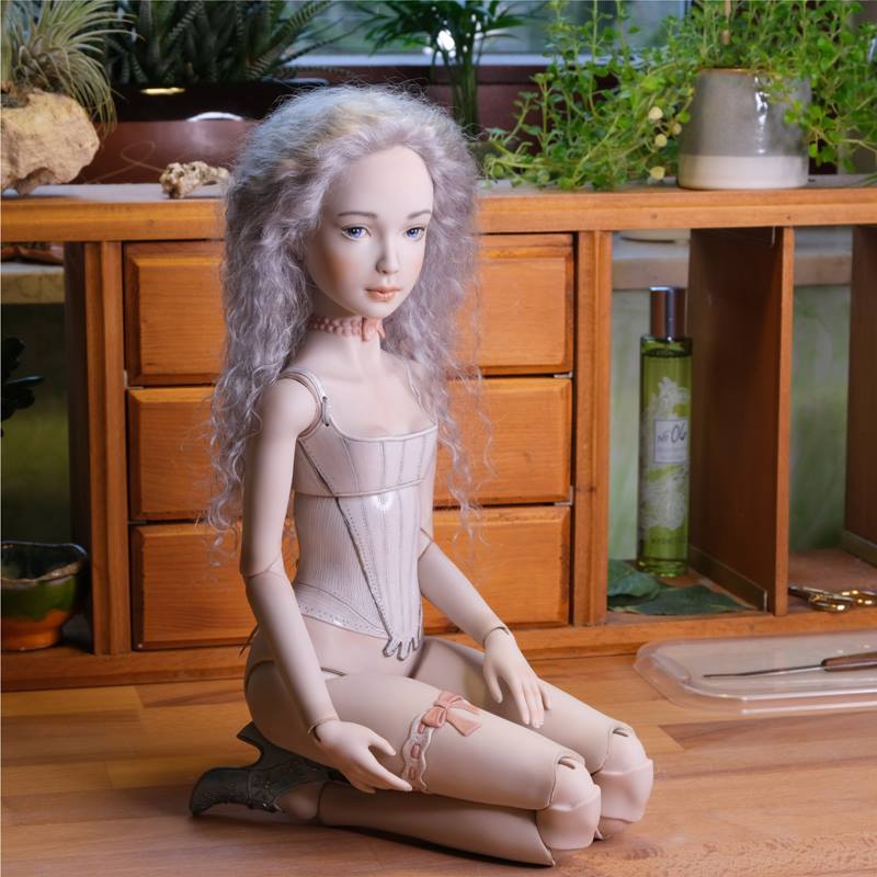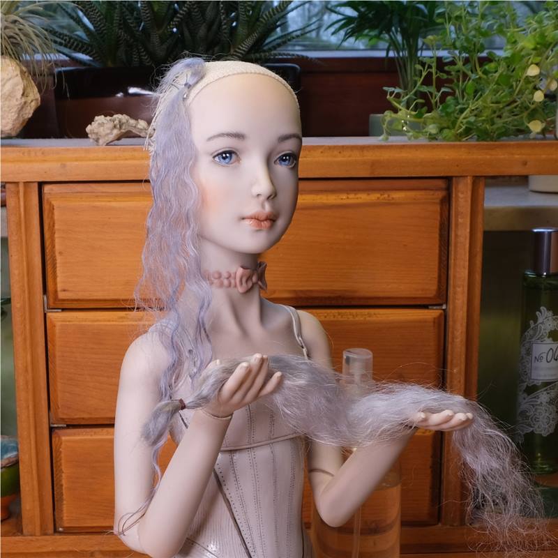 Ich habe feines, weißes Mohair-Haar in kleine Bündel separiert und unterschiedlich stark eingefärbt, so dass der silbergraue Farbton der Haarkappe Marie de Pompadours später leicht changiert.