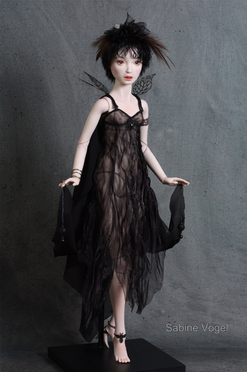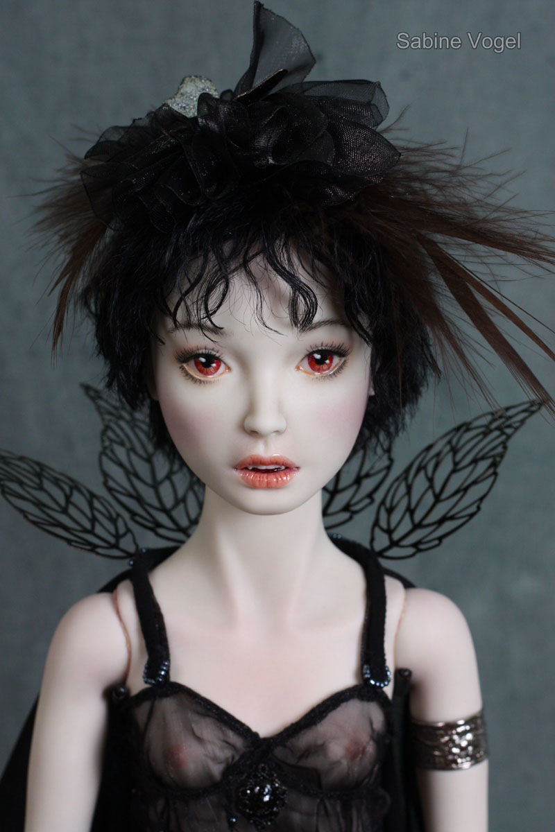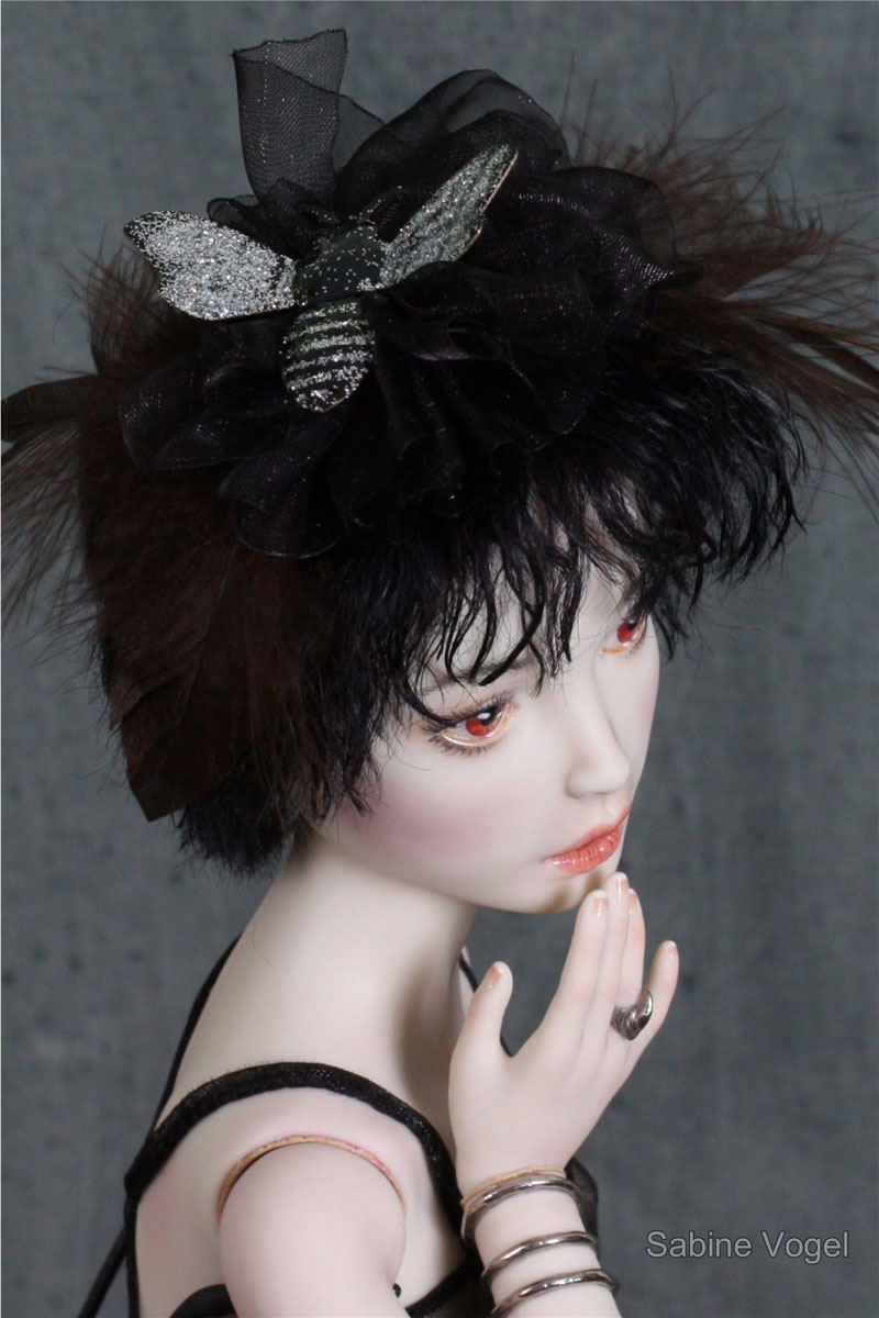 Porzellan, Porzellanfarbe, Zugfedern, Magnet, Mohair, Leder, Glanzplatin, syntetische Emaile, metallene Filigranornamente, synthetischer Stoff, japanische Itoshi Perlen, Federn.