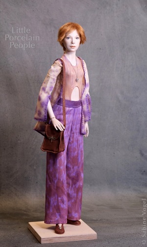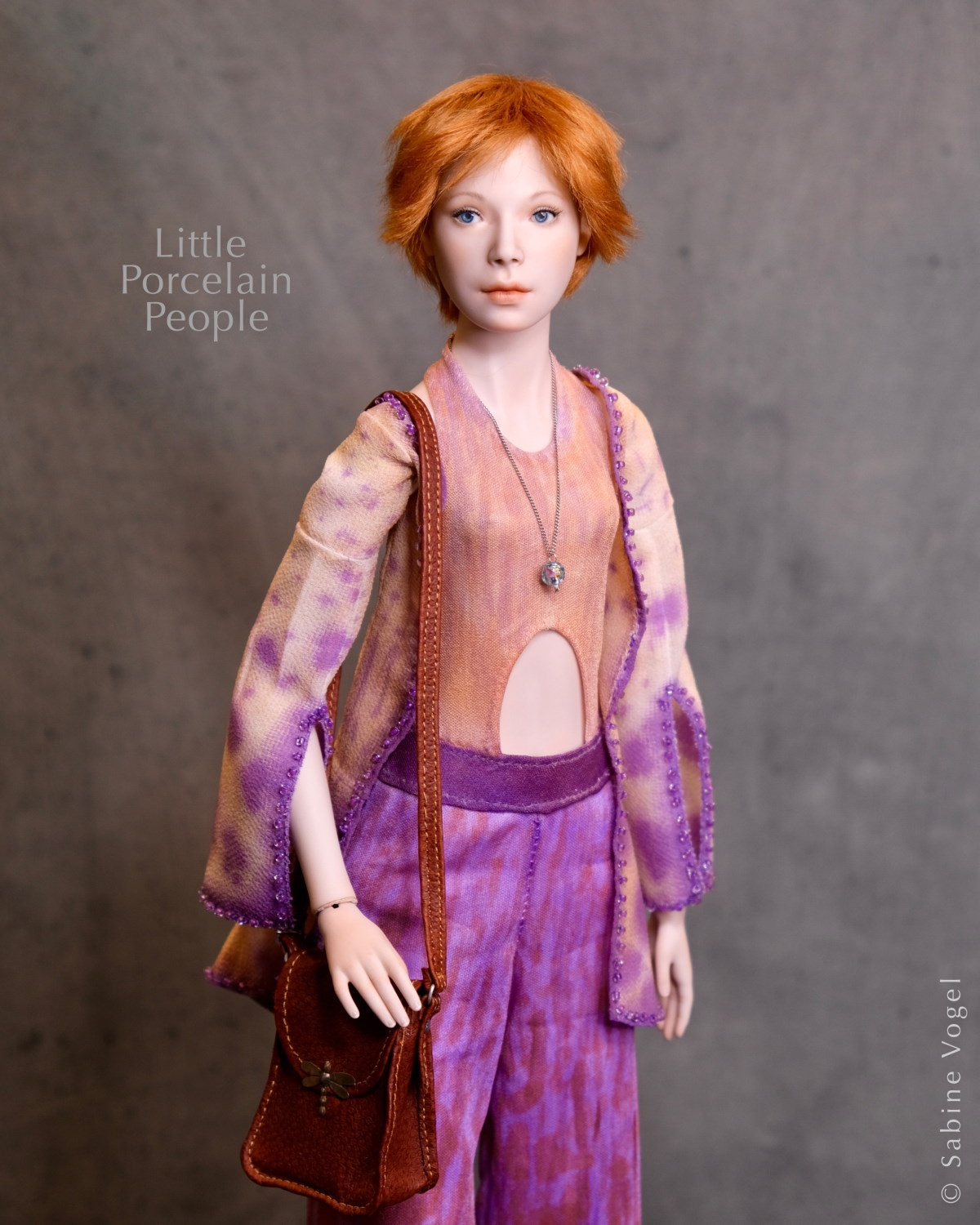 Die Jacke habe ich aus cremefarbenem Stoff genäht, bemalt und mit kleinen Glasperlen bestickt. Hose, genäht aus cremefarbenem Jersey, mit Gürtel und Top; bemalt. Ballerinas, gefertigt aus zimtfarbenem Leder, mit Metall-Applikation. Umhängetasche aus Leder genäht, mit Magnetverschluss und einer Libelle aus Metall als Zierelement.